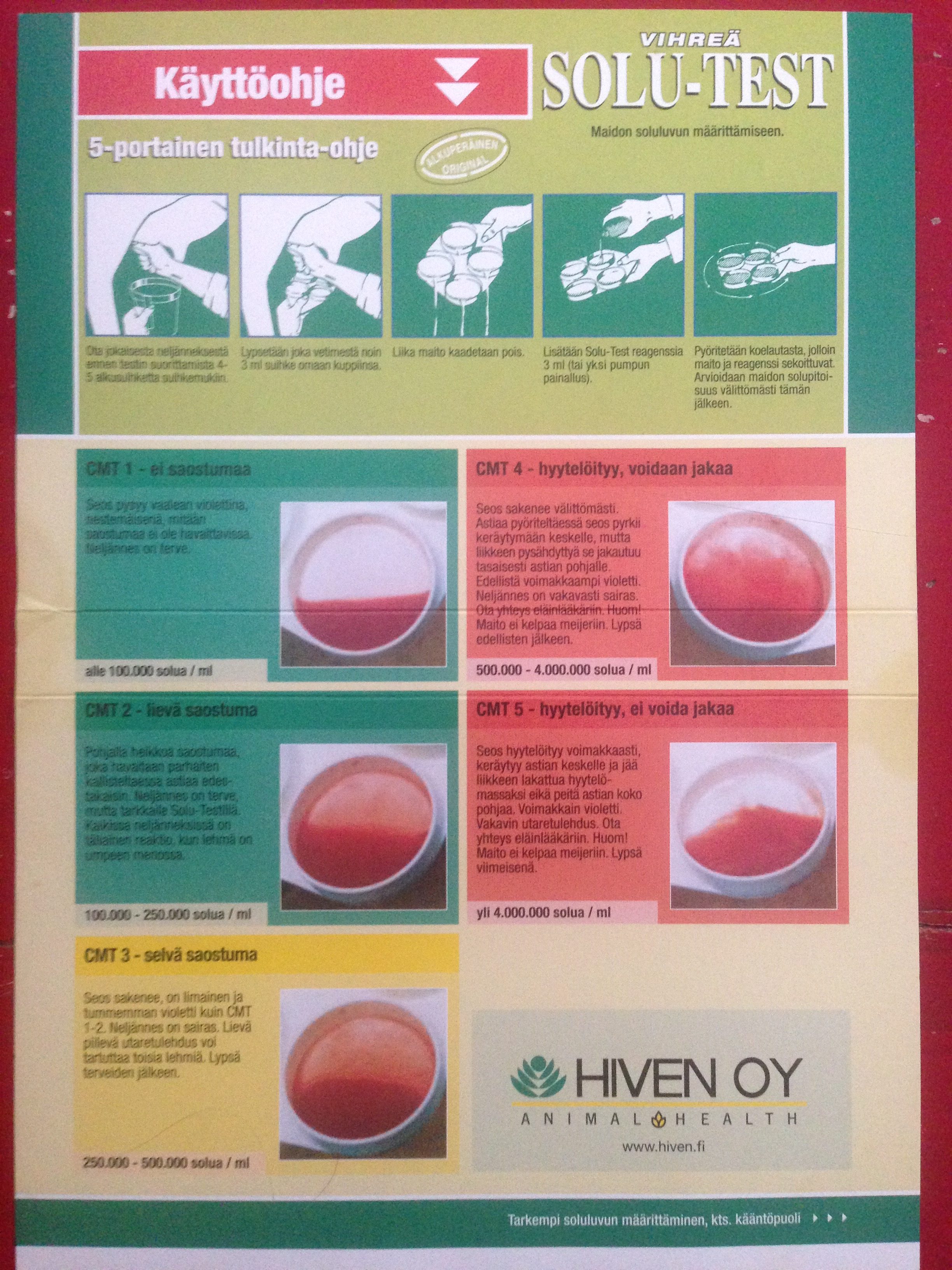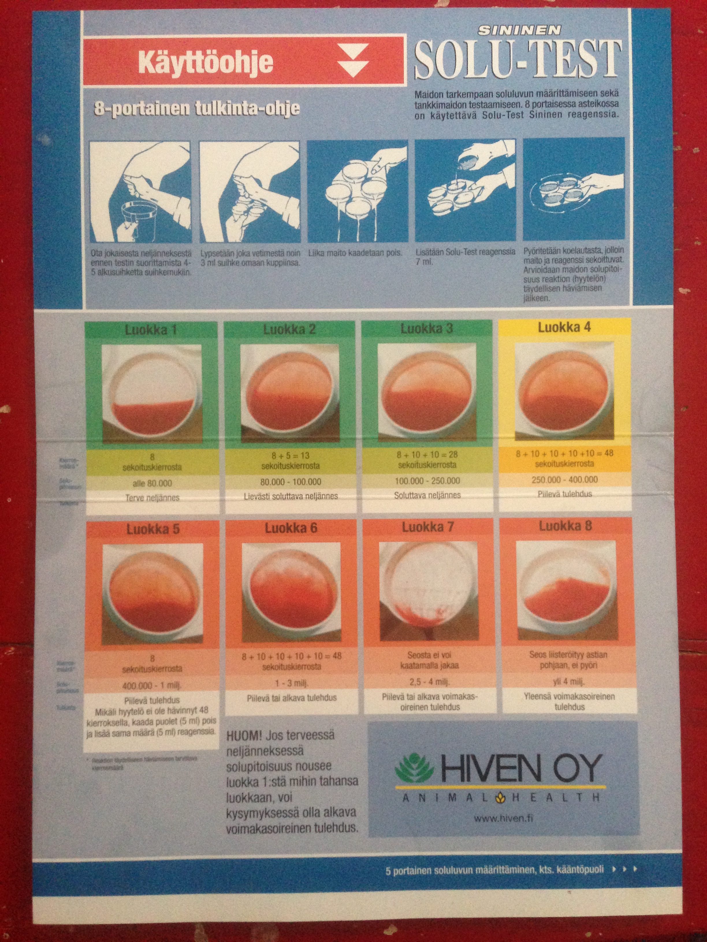 Seos sakenaa välittömästi. Astiaa pyörittäessä seos pyrkii keräytymään keskelle, mutta likkeen pysähdyttyä se jakautuu tasaisesti astian pohjalle. Edellistä voimakkaampi violetti. Neljännes on vakavasti sairas. Ota yhteyttä eläinlääkäriin. Huom! Maito ei kelpaa meijeriin lypsä edellisten jälkeen. 500 000 – 4 000 000 solua / / ml.