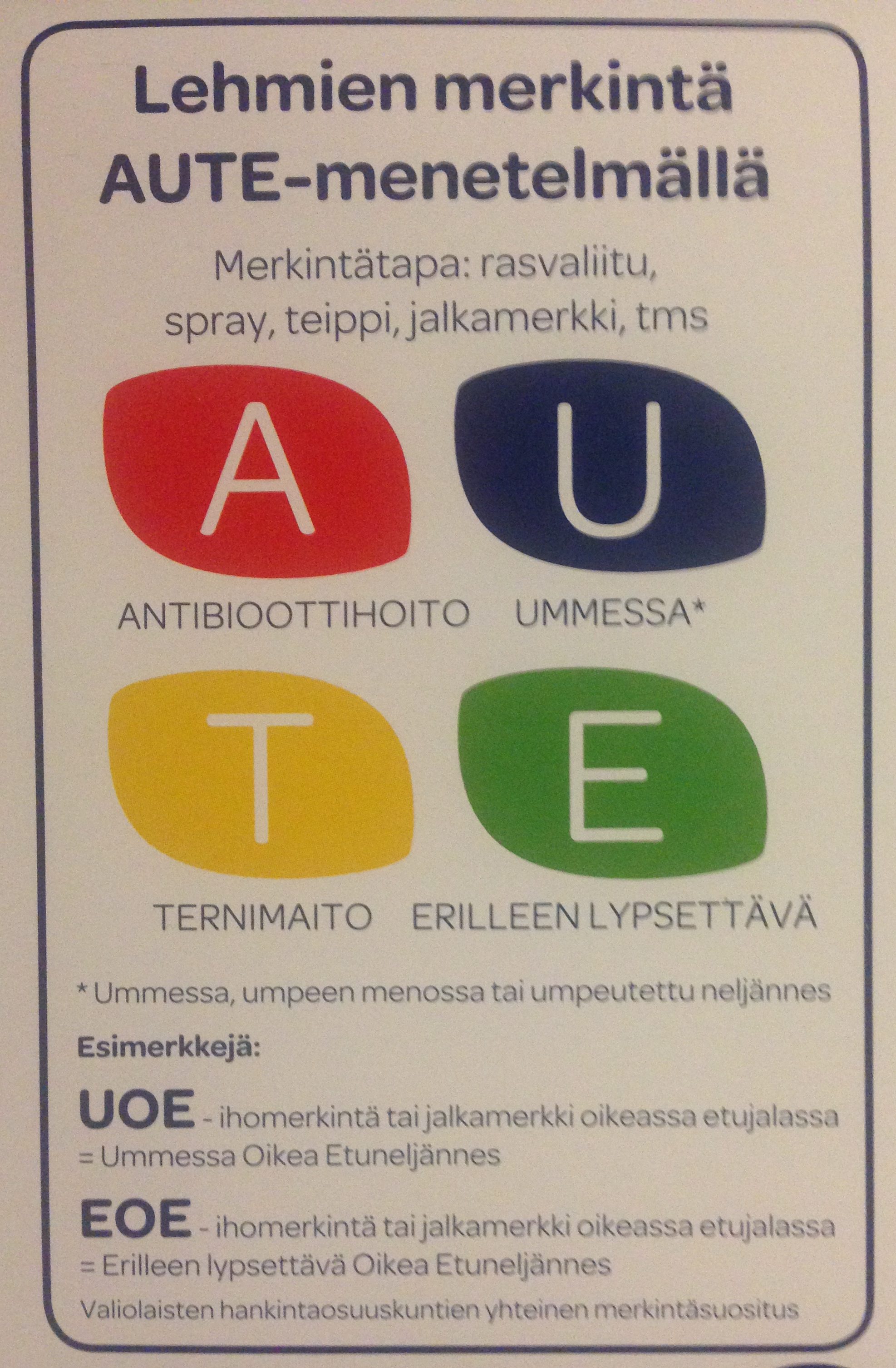 Jos joku lohko tuottaa runsaasti soluja, kutsutaan eläinlääkäri hän hoitaa antibiotilla joko lohko kohtaisesti tai kaikkia, tapauksesta riippuen. Eläimen tietoihin merkitään, jos vaikka OE soluttaa ja oikea etu erillislypsyyn. Lehmät kun ovat meillä vapaana käytämme AUTE (AUTE)-menetelmää. Lehmä voidaan näin merkitä väri koodilla jalkoihin, koska niitä on yhtä monta kuin vetimiä. Järjestelmä on kaikilla Valion tiloilla käytössä. Tämä järjestelmä helpottaa lomittajia ja muita lypsäjiä.
