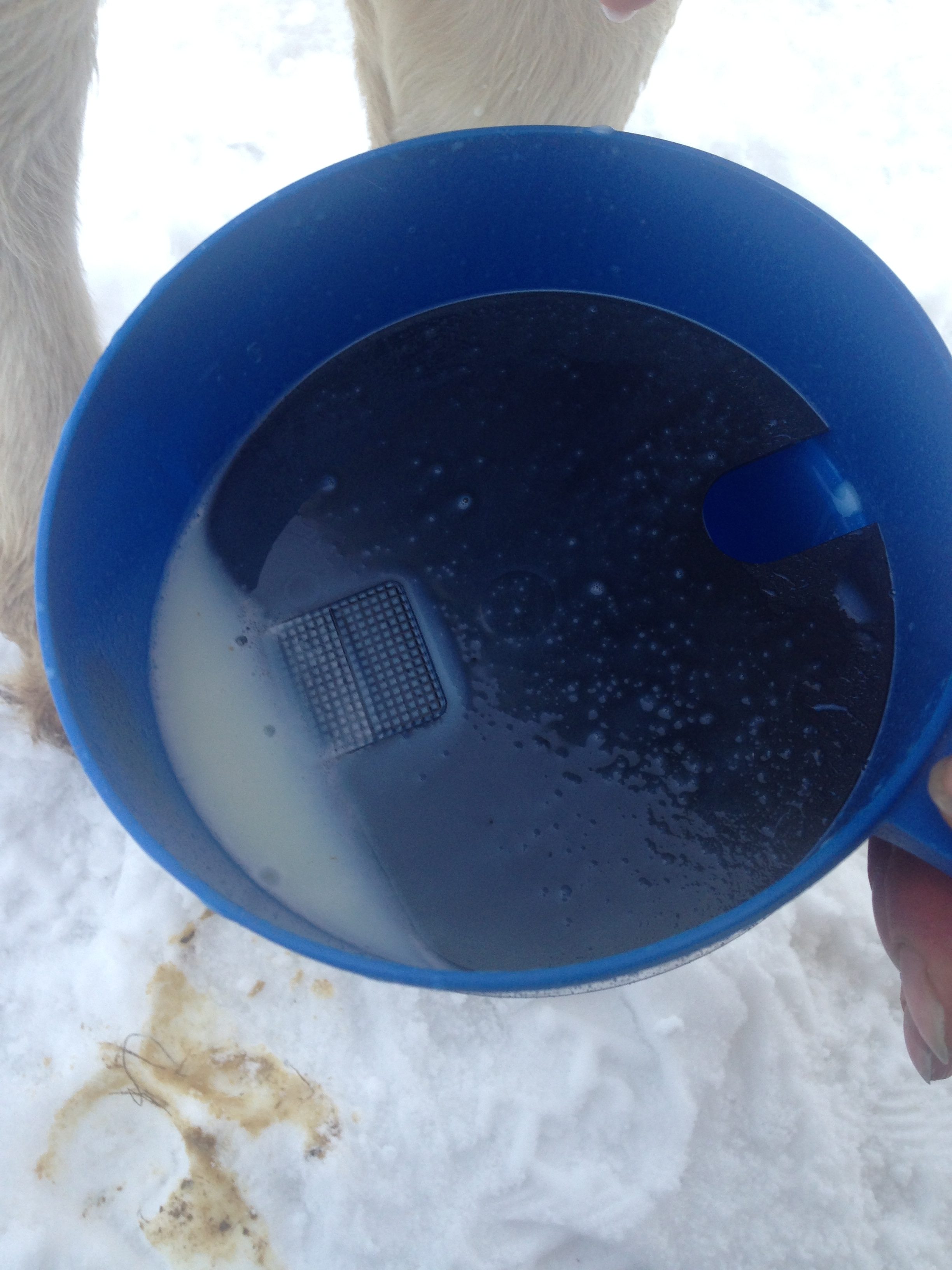 Seos hyytelöityy voimakkaasti, keräytyy astian keskelle ja jää liikkeen lakattua hyytelömassaksi eikä peitä astian koko pohjaa. Voimakkaasti violetti. Vakava utaretulehdus. Ota yhteyttä eläinlääkäriin. Huom! Maito ei kelpaa meijeriin. Lypsä viimeisenä. Yli 4 000 000 solua / ml.