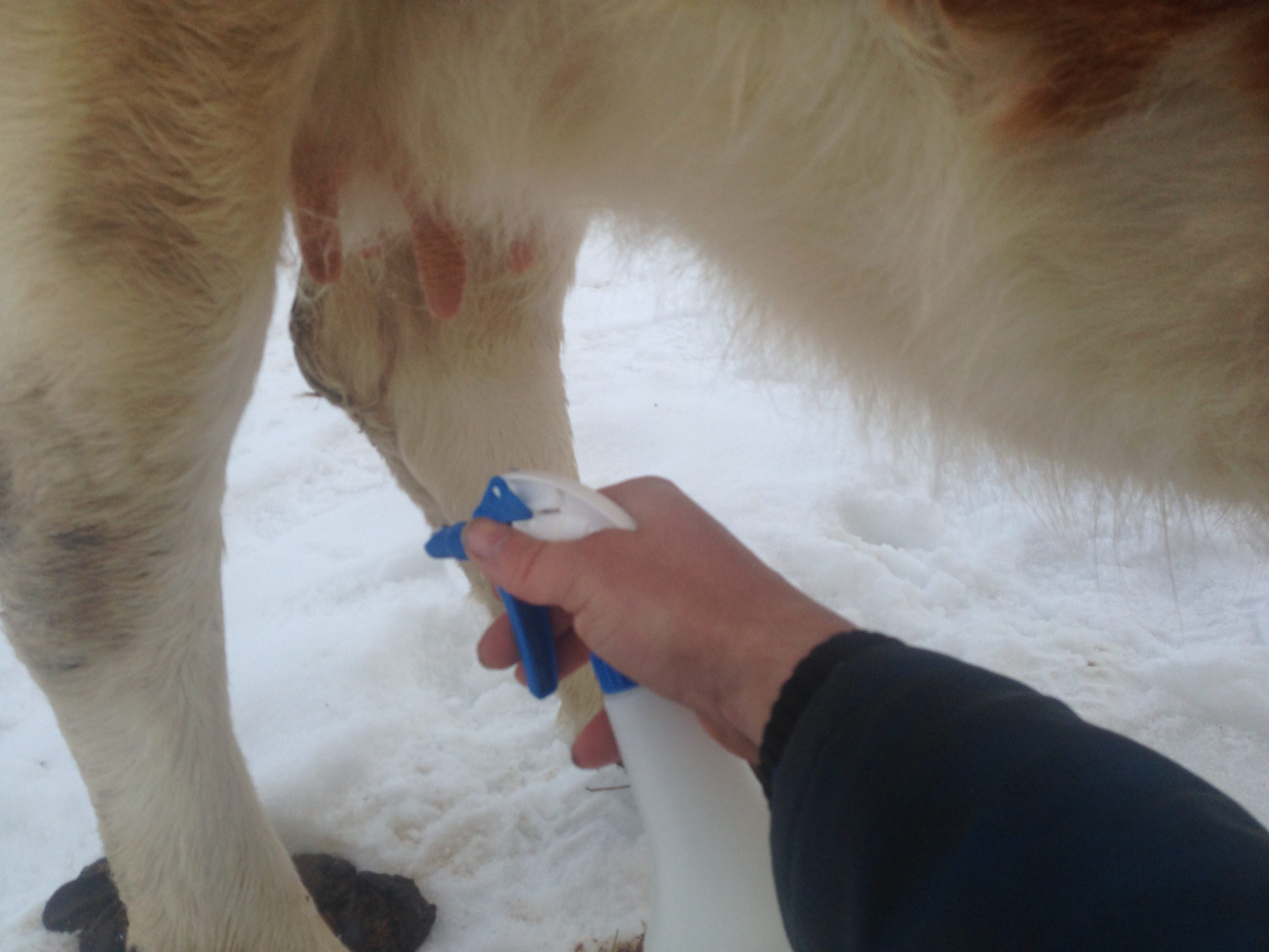 5. Loppusuihkeen aika joka hoitaa utareita ja antaa suojaa. Suihke imeytyy nopesti, joten pakkasellakaan käytölle ei ole esteetä. Suihkeelle on oma suihkepullo, jonka nokka on tehty niin, että suihkuttaa viistosti eteen ylös. Tämän takia säiliön pystyy suihkuttelemaan tyhjäksi.