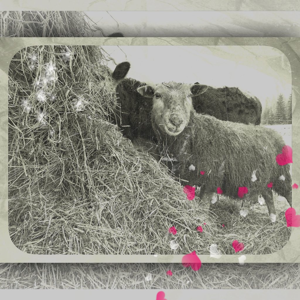 Tulin tilalle tuttipullo karitsana muutama kesä sitten. Tulin tuomaan tilalle värittömyyttä lammaslaumaan. Olen siis lampaiden lammas valkoinen niin kuin useimmat lampaat ovat. Tällä tilalla ei valkoisia ollut silloin kun tulin, yksi oli ollut mutta hänet ikä oli korjannut pois. Valkoinen väri on vahva väri, joten kumoan yleensä pässin värin. Tänä vuonna kun karitsoin olin ihan äimänä. Mä oon valkoinen ja pässi oli valkoinen mutta sain mustan karitsan ja toinen oli mustavalkoinen. En ollut uskoa todeksi tätä. Minulla oli hiukan hankaluuksia hyväksyä näitä kummalisen värisiä karitsoita omille tisseilleni. Ne kuitenkin haisi minulta ja vastasivat kun kyselin karitsoitani. Pikkuhiljaa hyväksyin, että värit voivat tulla sukupolvien yli. Olen tilan kookkaimpia uuhia ja karitsoillani on hyvä kasvu. Kuvassa mun vieressä seisoo Ima. Se alkaa päästä jo lehmän mittoihin niin ei sekoitu meihin lampaisiin.